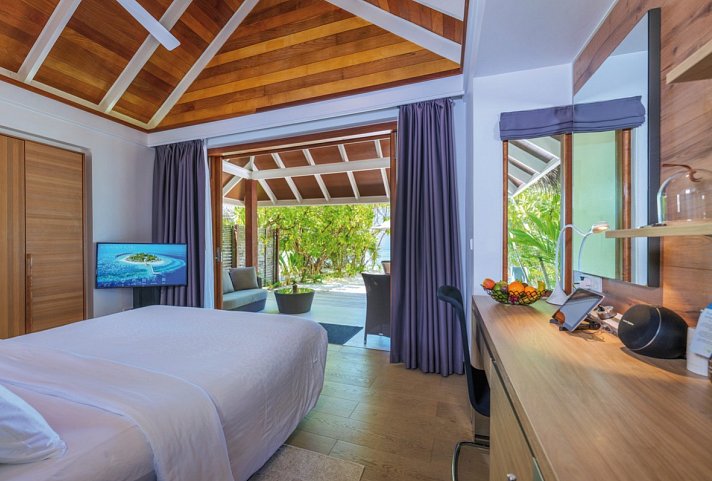 81-90 qm, Villa, Wasserbungalow (auf Stelzen über der Lagune), Dusche, Badewanne, WC, Bademantel, Badeslipper, Haartrockner, Klimaanlage, Ventilator, Minibar kostenpflichtig, Safe, TV, WLAN, Wasserkocher, Espressomaschine, Kaffee/Tee, Sonnendeck (möbliert), direkter Meerzugang, Privatpool