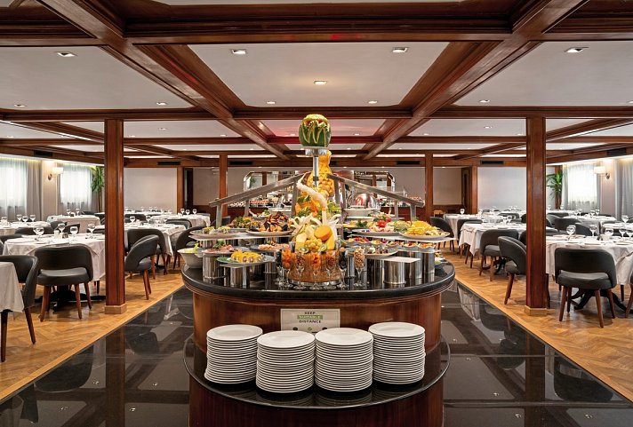 - 7 Nächte an Bord des genannten oder gleichwertigen Schiffs der First-Class in der gebuchten Kabinenkategorie (KH1V Hauptdeck bzw. KO1V Oberdeck)
