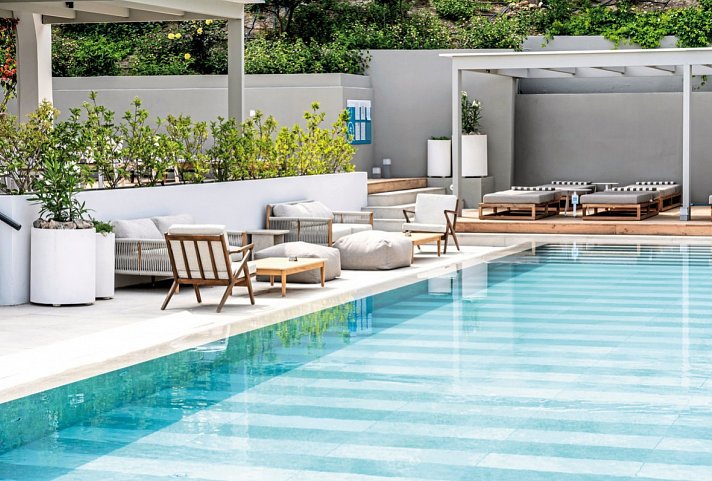 In Terrassen erstrecken sich die Hotelgebäude bis hinunter zum Meer und offenbaren wunderschöne Aussichten über die Bucht von Vlicha. Lifte bringen die Gäste hinunter zum Strand – und bequem wieder hoch. Innen erwartet Sie ein elegantes Ambiente. Das hat Stil!