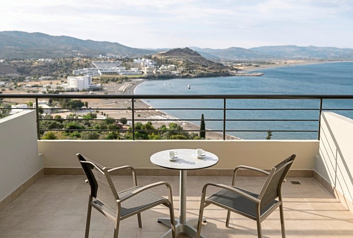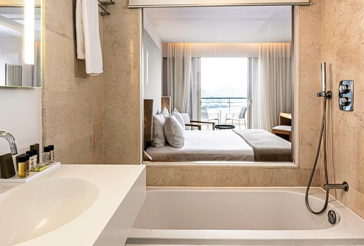 Juniorsuite, Meerblick (seitlich), kombinierter Wohn-/Schlafraum, Sitzecke, Couch, 1 Bad, Badewanne, WC, Haartrockner, Klimaanlage, individuell regulierbar, Safe, 1 TV (Sat-TV, Smart-TV), WLAN, Kaffee/Tee, Kühlschrank, Balkon oder Terrasse (möbliert)