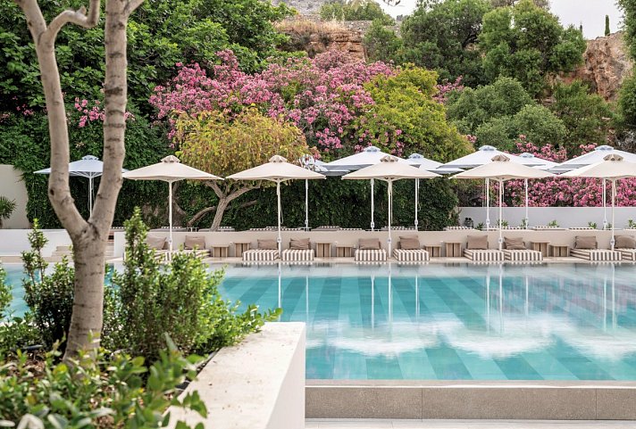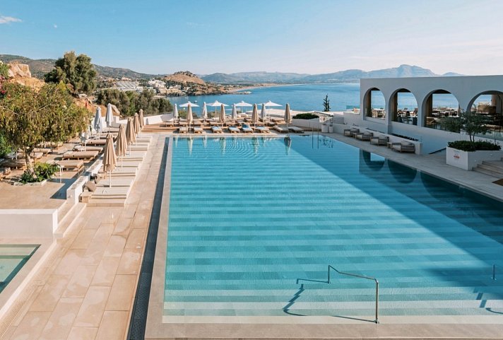In Terrassen erstrecken sich die Hotelgebäude bis hinunter zum Meer und offenbaren wunderschöne Aussichten über die Bucht von Vlicha. Lifte bringen die Gäste hinunter zum Strand – und bequem wieder hoch. Innen erwartet Sie ein elegantes Ambiente. Das hat Stil!
