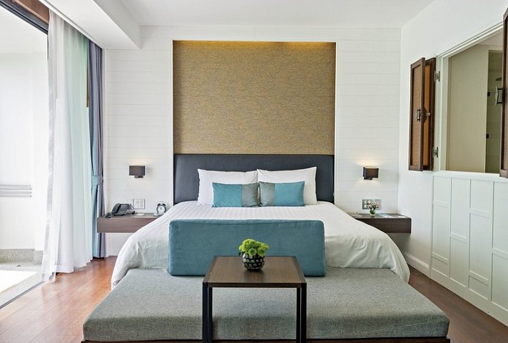 51-60 qm, Suite, Nebengebäude, Etage, 1., Gartenblick, Nichtraucher, Bettwäsche, Handtücher und Matratzen aus 100% Bio-Baumwolle, Dusche, WC, Bademantel, Klimaanlage, individuell regulierbar, Ventilator, Minibar, Auffüllung täglich, Safe, TV (landestypisches Programm), Bluetooth-Lautsprecher, Balkon