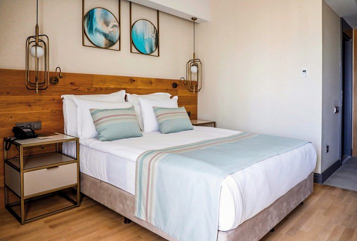 26-30 qm, Doppel, Superior, Meerblick, Dusche, WC, Bademantel, Badeslipper, Haartrockner, Klimaanlage, zentral gesteuert, Minibar, Auffüllung regelmäßig, Softdrinks, Mineralwasser, Bier, Säfte, Wasser, Safe, 1 TV (Sat-TV, Flachbildschirm), Espressomaschine, Kaffee/Tee, Balkon