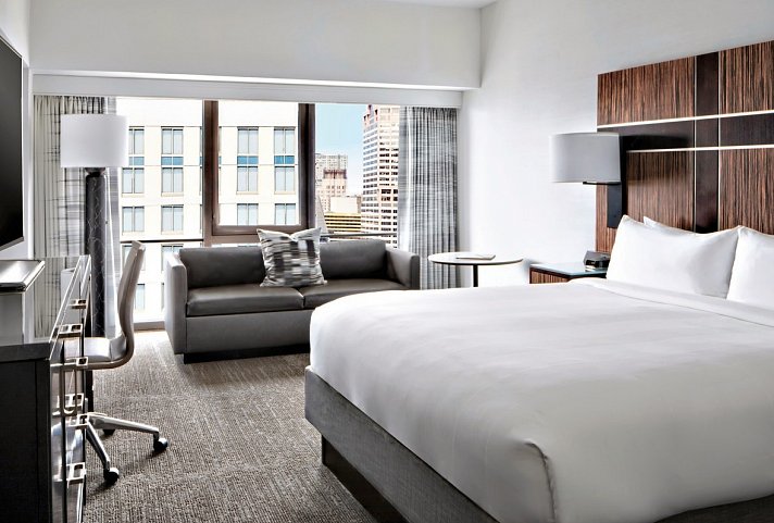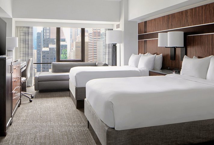 Das Hotel liegt direkt am Times Square, in der Nähe berühmter Sehenswürdigkeiten wie dem Rockefeller Center oder dem Central Park. Im Drehrestaurant in der obersten Etage genießen Sie einen 360 Grad Blick auf Manhattan.