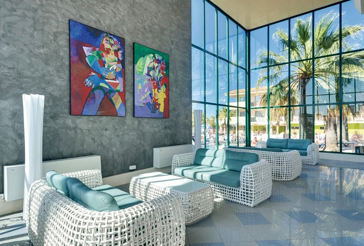 Sanfte Pastelltöne dominieren, innen wie außen. Moderne Zimmer mit Farben und Mustern zum Wohlfühlen. Am Pool sorgen Bali-Betten für Gemütlichkeit und Schatten. Die Sportplätze bieten Fun & Action.