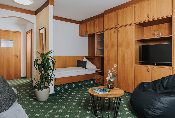 Die größeren Doppelzimmer Komfort (ca. 40 ², min. 2/max. 2 Vollzahler + 1 Kind) bestehen bei gleicher Ausstattung aus einem getrennten Wohn- und Schlafbereich.