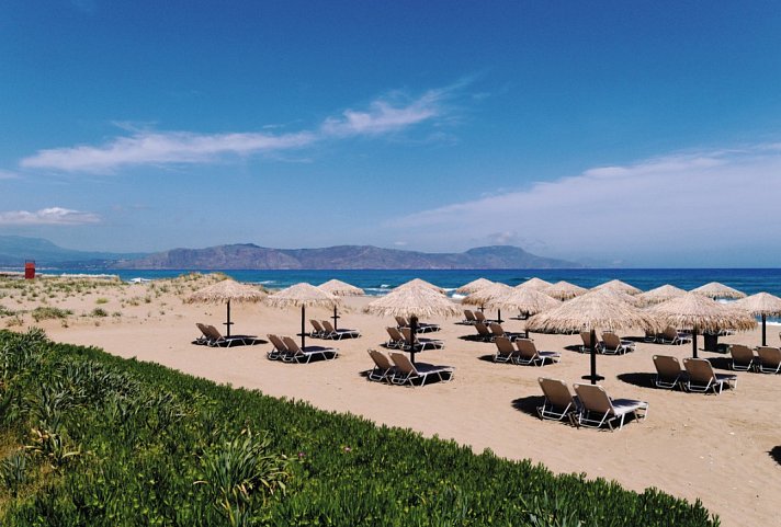 Sand-/Kieselstrand: leicht abfallend, öffentlich, ca. 5 km lang, von der Anlage getrennt durch Straße, Strandtuch/Badetuch (kostenpflichtig)