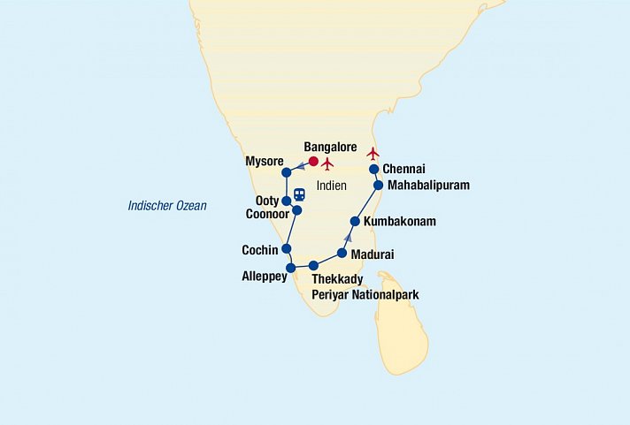 Namasté im Land der Vielfalt - willkommen in Südindien! Mystische Hindu-Tempel voller Spiritualität, farbenfrohe Märkte, prachtvolle Bauten, tropische Landschaften und üppige Bergregionen samt einer reichen Tier- und Pflanzenwelt – auf dieser Rundreise lernen Sie die faszinierenden Bundesstaaten Tamil Nadu, Kerala und Karnataka im Süden Indiens hautnah kennen. Sie starten im pulsierenden Bangalore, eine hochmoderne Metropole mit postkolonialem Charme. Spüren Sie in Mysore den Geist der alten Maharadschas und fahren Sie inmitten der malerischen Nilgiriberge mit einem historischen „Toy Train“ zur Hill Station in Ooty. Nach einer idyllischen Hausbootfahrt auf den Wasserstraßen der Backwaters von Alleppey, wandeln Sie in der Hafenstadt Cochin auf den Spuren der Kolonialherren. Magische Naturschönheit und eindrucksvolle Artenvielfalt erwarten Sie hingegen im Periyar Nationalpark bei Thekkady. Weiter Highlights wie die Besichtigung des Felsreliefs von Mahabalipuram (UNESCO-Weltkulturerbe) und der Glanz und Glamour von Bollywood in Chennai am Golf von Bengalen werden Sie von der Schönheit Südindiens überzeugen!