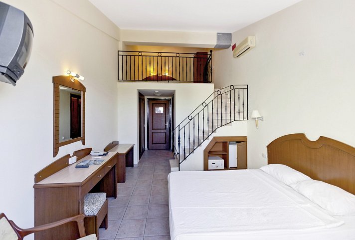 31-35 qm, Zweibett, Duplex, Hauptgebäude, 1 separates Schlafzimmer, kombinierter Wohn-/Schlafraum, 1 Bad, Badewanne, WC, Haartrockner, Fliesen, Klimaanlage, individuell regulierbar, Minibar, Auffüllung regelmäßig, Wasser, Safe (kostenpflichtig), 1 TV (Sat-TV), WLAN, Wasserkocher, Kaffee/Tee, Balkon