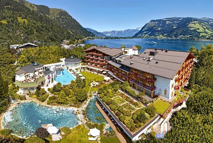 Der Salzburgerhof verzaubert mit seinem einzigartigen Wellness-Schlössl. Eingebettet in die traumhafte Landschaft des Salzburger Landes verströmt das Schmuckstück heimische Atmosphäre. Das Hotel liegt nahe dem See und der reizvollen Altstadt. Das Herzstück ist das 3.500 qm Wellness Schlössl (3 Relax-Guide-Lilien) auf 3 Etagen. Fitnessraum mit Gartenblick, 6 Saunen, osmanisches Dampfbad, Liege-/Ruhebereiche, teilweise mit beheizten Wasserbetten, Poollandschaft mit Gartenteich, Sportbecken (20 m, ganzjährig beheizt), Panorama-Whirlpool, 2 Hallenbäder, Laconium, Tepidarium. Massagen, Anwendungen gegen Gebühr. Ein Park mit einem alpinen Feng-Shui-Garten lädt zum Entspannen ein. Golfclub Zell am See/Kaprun (Ermäßigung für Hotelgäste) in der Nähe. Indoor-Golf (gegen Gebühr). Täglich kostenloses Aktivprogramm mit Yoga, Qi Gong, Pilates, Rückenfit, Klangschalenmeditation, geführte Wanderungen im Sommer. Die Schmittenhöhe und das Gletscherskigebiet Kitzsteinhorn bieten perfekte Skibedingungen. Der Flughafen Salzburg ist ca. 80 km, München ca. 200 km und der Bahnhof ca. 500 m entfernt. Transfer vom Bahnhof auf Anfrage ohne Gebühr. Gebührenfreier Tiefgaragenplatz pro Zimmer. Hotel Shuttelbusse zu den Bergbahnen und zum Golfplatz inklusive.