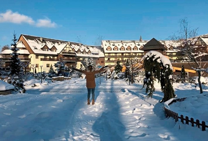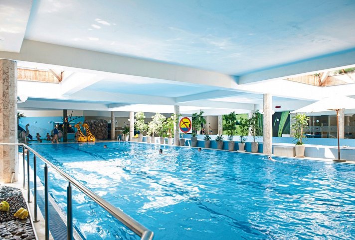 Wasservergnügen und Erholung für Gäste jeden Alters: Während sich Kinder im Aquapark mit Wasserrutschen vergnügen, können Erwachsene wohltuende Wellness-, Entspannungs- und Gesundheitsanwendungen genießen.