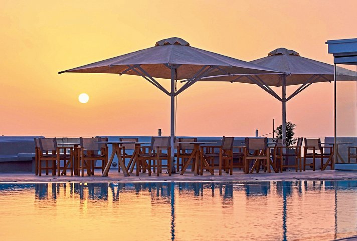 Mit seinem strahlenden Weiß steht das komfortable Hotel in typischer Kykladen-Architektur im reizvollen Kontrast zum tiefen Blau der Ägäis, die ihm zu Füßen liegt. Ideal für entspannten Urlaub!