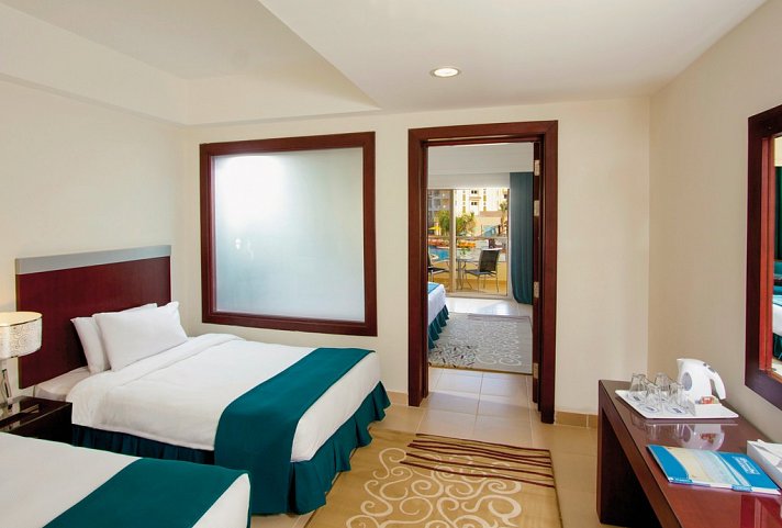 61-70 qm, 2 Doppelzimmer, nebeneinander, Poolblick, 2 separate Schlafzimmer, (verbunden durch einen Vorraum), 2 Einzelbetten, Doppelbett, 2 Bäder, Dusche, Haartrockner, Klimaanlage, Minibar kostenpflichtig, Safe, TV, Balkon oder Terrasse (möbliert), nahe des Aquaparks
