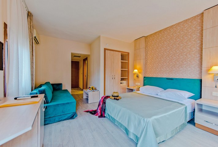 26-30 qm, Familien, Großraum, Gartenblick, optisch getrennter Wohn-/Schlafraum, Doppelbetten (1 Doppel- oder 2 Einzelbetten), Sofabett, 1 Bad, Dusche, Haartrockner, Laminatboden, Klimaanlage, zentral gesteuert, Minibar, Auffüllung täglich, Softdrinks, Bier, Wasser, Safe, TV (Sat-TV, Smart-TV), Balkon oder Terrasse