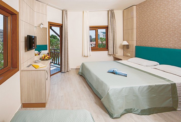 21-25 qm, Doppel, Poolblick, Doppelbetten (1 Doppel- oder 2 Einzelbetten), Sofabett, Dusche, WC, Bademantel, Badeslipper, Haartrockner, Laminatboden, Klimaanlage, zentral gesteuert, Minibar, Auffüllung täglich, Softdrinks, Bier, Wasser, Safe, TV (Sat-TV, Smart-TV), Wasserkocher, Kaffeemaschine, Kaffee/Tee, Terrasse, direkter Poolzugang, Gemeinschaftspool (beheizbar)