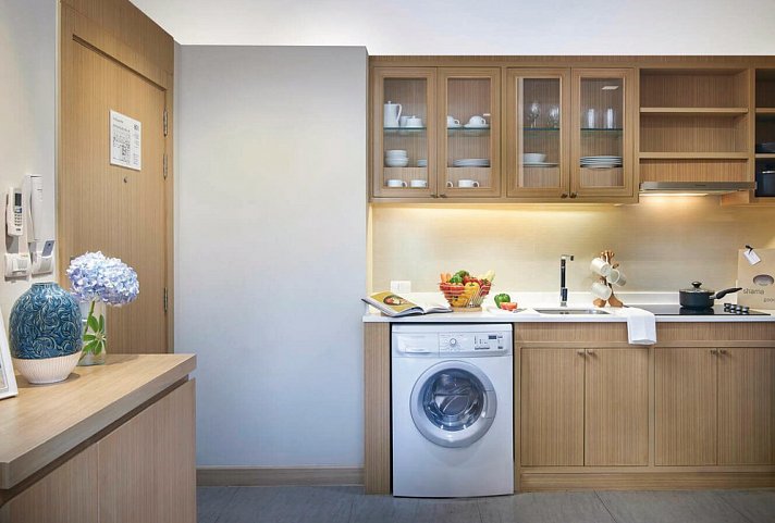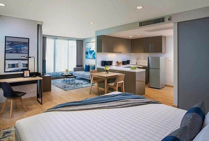 51-60 qm, Doppel, Stadtblick, 1 separates Schlafzimmer, Sitzecke, Schreibtisch, Couch, Dusche, Badewanne, WC, Haartrockner, Klimaanlage, Safe, Bügeleisen, Waschmaschine, Trockner, TV, Kochnische, Backofen, Wasserkocher, Mikrowelle, Kaffee/Tee, Kühlschrank, Balkon