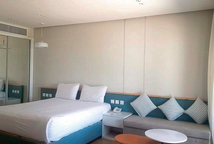 61-70 qm, Familien, Meerblick (seitlich), 2 separate Schlafzimmer, Sitzecke, Schreibtisch, Twinbett, Doppelbett (Kingsize), Regendusche, Haartrockner, Klimaanlage, Minibar kostenpflichtig, Mini-Kühlschrank, Safe, TV, Terrasse (möbliert), bei Ankunft im Zimmer Wasser