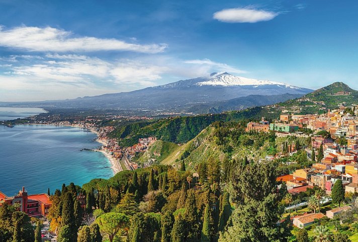 Ebenso sehenswert wie die historischen Gebäude sind die landschaftlichen Highlights Siziliens – darunter der höchste, aktive Vulkan Europas, der Ätna. Eingebettet in eine bergige, vorwiegend grüne Landschaft, ragen die vier Gipfelkrater des Vulkans mehr als 3.000 Meter in die Höhe. Weitere Seitenkrater sowie Lavastromhöhlen vollenden das eindrucksvolle Bild. Der Vulkan lässt sich während Ihres Sizilien-Urlaubs sowohl geführt als auch auf eigene Faust besteigen. Beachten Sie bei Ihrer Planung, dass Sie ohne Guide nur auf die maximale Höhe von 2.800 Meter steigen dürfen.