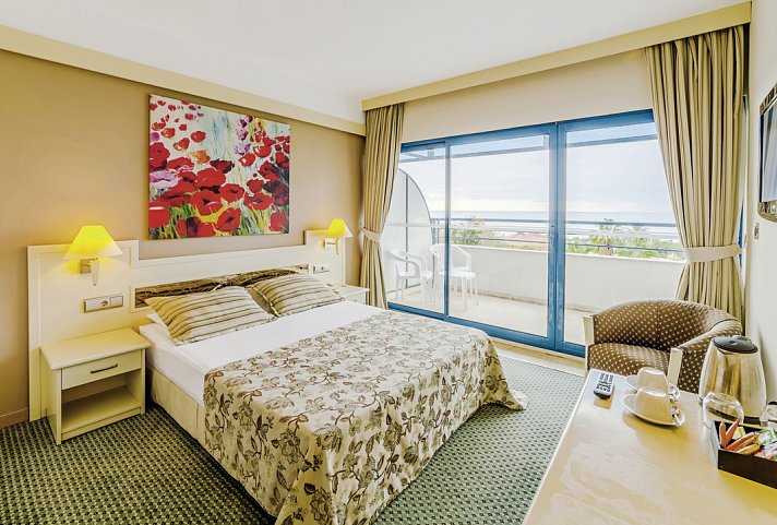26-30 qm, Doppel, Hauptgebäude, Meerseite, Meerblick, 2 Einzelbetten, 1 französisches Bett, Badewanne, Haartrockner, Teppich, Klimaanlage, zentral gesteuert, Minibar, Auffüllung regelmäßig, Softdrinks, Bier, Wasser, Safe, 1 TV (Sat-TV), Wasserkocher, Kaffee/Tee, Balkon