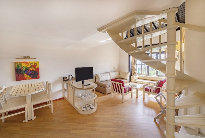 61-70 qm, Maisonette, 2 Etagen, Nebengebäude, Gartenseite, Gartenblick, 2 separate Schlafzimmer, Sitzecke, 2 Einzelbetten, 2 Sofabetten, 1 französisches Bett, 2 Bäder, Dusche, WC, Haartrockner, Laminatboden, Klimaanlage, zentral gesteuert, Minibar, Auffüllung regelmäßig, Softdrinks, Wasser, Safe, 2 TVs (Sat-TV), Wasserkocher, Kaffee/Tee, Balkon