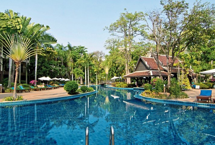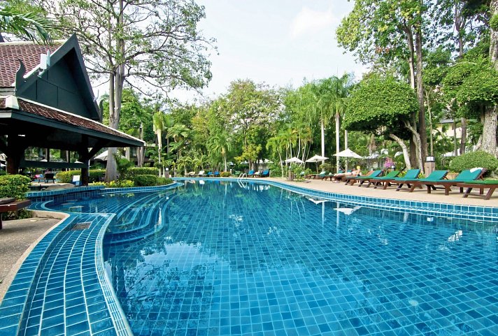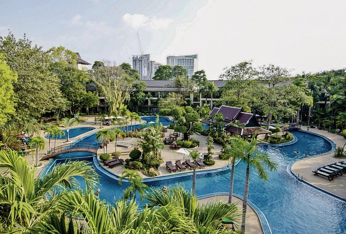 Palmen, Frangipani-Bäume und blühende Büsche: Der Name des Resorts ist Programm. Der lagunenartige Pool mit Whirlpools an den Rändern ist der ideale Ort, um die grüne Pracht zu genießen!