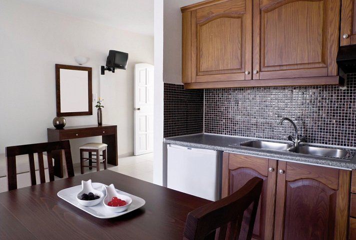 26-30 qm, Studio, Superior, Gartenblick oder Bergblick oder Poolblick, renoviert, kombinierter Wohn-/Schlafraum, Doppelbett, 1 Bad, Dusche, bodengleiche Dusche, WC, Haartrockner, Kosmetikspiegel, Klimaanlage, Safe (kostenpflichtig), 1 TV (Sat-TV, deutschsprachiges Programm, landestypisches Programm, sonstiges Programm), Kochnische, Essecke, Wasserkocher, Kühlschrank, Balkon oder Terrasse (möbliert)
