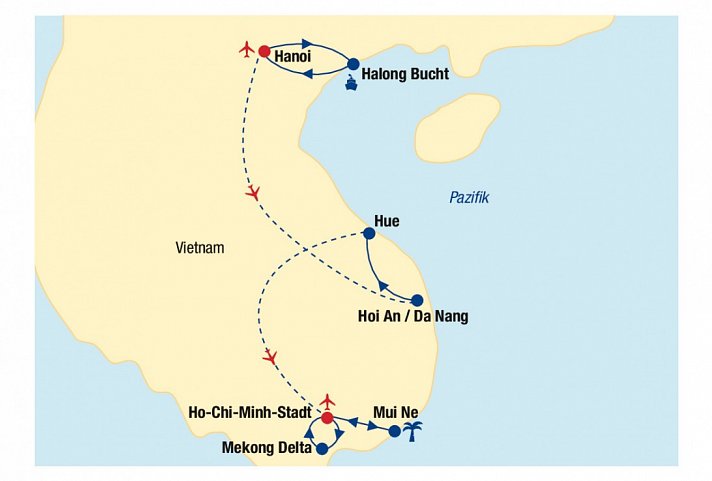 Vietnam, eines der schönsten Länder Südostasiens, erwartet Sie mit besonders vielfältiger Kultur und imposanter Natur. Sie starten Ihre Rundreise durch das beeindruckende Land in dessen Hauptstadt Hanoi, welche einen perfekten Einblick in die unterschiedlichen kulturellen Prägungen Vietnams gibt. Ein Highlight Ihrer Reise ist die Panoramafahrt durch das UNESCO Weltnaturerbe der Halong Bucht, wo Sie sich mit einer traditionellen Dschunke Ihren Weg durch die zahlreichen Inseln bahnen. Ein Mix aus französischem Erbe und asiatischer Gemütlichkeit, gepaart mit einem quirligen Nachtleben und Weltklasse-Kulinarik erwartet Sie in Ho-Chi-Minh-Stadt, das ehemalige Saigon. Im Mekong-Delta werden Sie begeistert sein vom ländlichen Leben zwischen Reisfeldern und Obsthainen. Krönender Abschluss Ihrer Reise ist Ihr Badeaufenthalt an der Küstenregion mit kilometerlangen Stränden und goldfarbenen Dünen, wo Sie Ihre gesammelten Eindrücke Revue passieren lassen können. Tauchen Sie ein in ein Land voller Exotik mit liebenswürdigen Menschen und einer Gastfreundschaft, die ihresgleichen sucht!