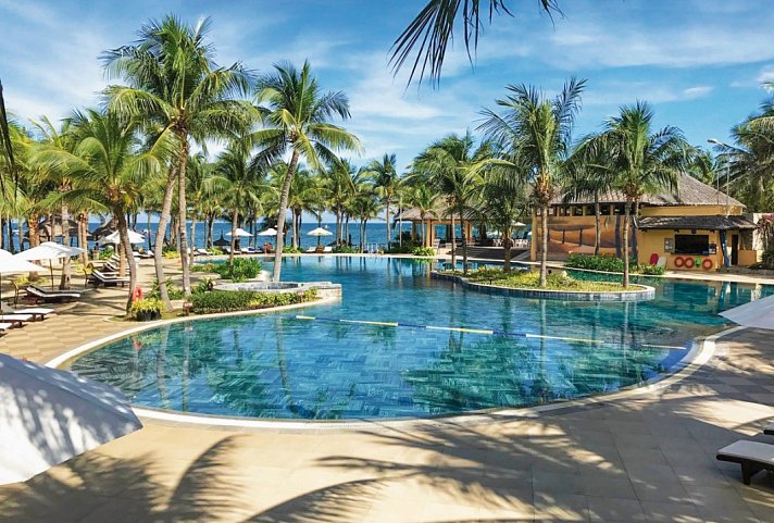 Eingebettet zwischen Strand und Dünenlandschaft erwartet Sie das 4-Sterne Pandanus Resort (Landeskat.) am schönsten Küstenabschnitt von Mui Ne (Ortszentrum: ca. 1,6 km). Inspiriert von der multikulturellen Champa-Dynastie besticht die Architektur des Pandanus Resorts mit geradlinigem Design, aufwendig geschnitzten Holz- und Steinelemente sowie hohen Holzdecken. Mal aus roten Ziegeln, mal aus exotischen Palmenblättern bestehen die Dächer. Die 10 Hektar große Gartenanlage gleicht einer grünen und blühende Palmenoase. Hängematten laden hier zum Träumen ein. Zu den weiteren Annehmlichkeiten der Anlage zählen Restaurants, Bars und 2 große Lagunenpools mit integrierten Whirlpools (Liegen, Sonnenschirme und Badetücher am Strand/Pool kostenfrei). Das Sportangebot beinhaltet Fitnessraum, Beachvolleyball, Tennisplatz, Fahrradverleih (nach Verfügbarkeit), Tai Chi und Yoga sowie gegen Gebühr Wellnessbereich mit Sauna, Dampfbad und Anwendungen.