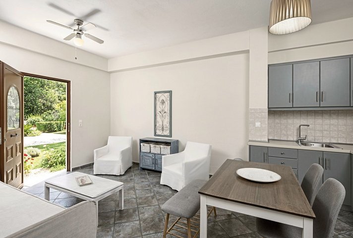 36-40 qm, Villa, Deluxe, Nebengebäude, Gartenblick, kombinierter Wohn-/Essraum, Doppelbett, Sofabett, Dusche, WC, Haartrockner, Fliesen, Ventilator, Safe, Kochnische, Kühlschrank, Terrasse, Bettwäschewechsel (1 x wöchentlich), Handtuchwechsel (2 x wöchentlich)