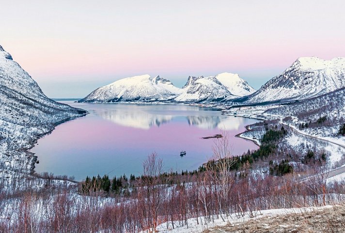 Heute gehen Sie an Bord des schnellen Katamarans „Hurtigbåt“. Mit Geschwindigkeiten von bis zu 70 km/h verbinden die Katamarane die Orte entlang der Küste. Sie folgen dabei der gleichen Route wie die bekannten Postschiffe. Genießen Sie traumhafte Ausblicke auf die arktische Küste. Nach der Ausschiffung in Finnsnes erleben Sie eine etwa einstündige Fahrt über das kontrastreiche Inland der Insel Senja an die bergige und zerklüftete Küste auf der Atlantikseite. Während an der Küste oft nur wenige Minusgrade herrschen, kann es im Binnenland der Insel gut 20 Grad kälter sein. Das Mikroklima hat hier eigene Gesetze. Geschützt und in einer großartigen Landschaft gelegen, erreichen Sie das an der Küste gelegene Dorf Hamn i Senja mit der gleichnamigen Hotelanlage. Seit 1980 wird der Fischerhafen als solcher nicht mehr genutzt. 1994 wurde dieser sorgfältig renoviert und in eine gemütliche, stilvolle Hotelanlage mit modernen, hellen und freundlichen Unterkünften umgebaut. Durch die Panoramafenster Ihrer Suiten haben Sie einen herrlichen Blick auf den Hafen und das Meer. Am Abend sind Sie im ehemaligen Leuchtturm eingeladen, der mit gemütlicher holzvertäfelter Einrichtung zum Verweilen einlädt. Auf wärmenden Rentierfellen und mit warmen Getränken können Sie bei guter Sicht das Lichtspektakel der Polarlichter bestaunen. 3 Nächte im Küstenhotel Hamn i Senja (gehobene Mittelklasse). (Frühstück, Abendessen)
