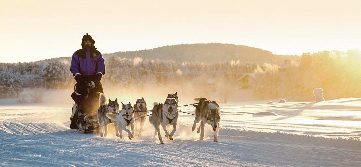 An diesem Tag steht ein ganz besonderes Erlebnis auf dem Programm. Nach einer fachkundigen Einweisung durch Ihren Guide unternehmen Sie eine Hundeschlitten-Safari (ca. 45-60 Min.). Ein unbeschreibliches Gefühl, wenn die lebensfrohen Huskies die Schlitten durch die winterweiße Landschaft ziehen. Es fahren jeweils zwei Personen pro Schlitten, unterwegs können Sie sich abwechseln. Gesamtdauer des Ausflugs: ca. 3 Stunden (Frühstück, Mittagessen, Abendessen)